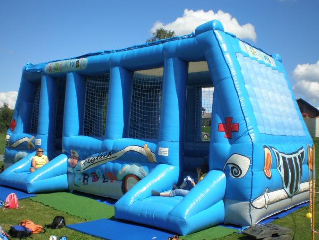 Action und Spaß auch für die Zuschauer! Vorraussetzungen: 2 Betreuer/innen Stromkreis 230 Volt (2 KW), 16 A trockene, ebene Fläche von 14 x 8 Metern mind. 5 m Höhe Beschreibung: Der Bungee Soccer kann dreifach genutzt werden: Als Bungee Soccer , wobei jeweils 2 Spieler an der Rückwand an einem Gummiseil befestigt werden und gegen…