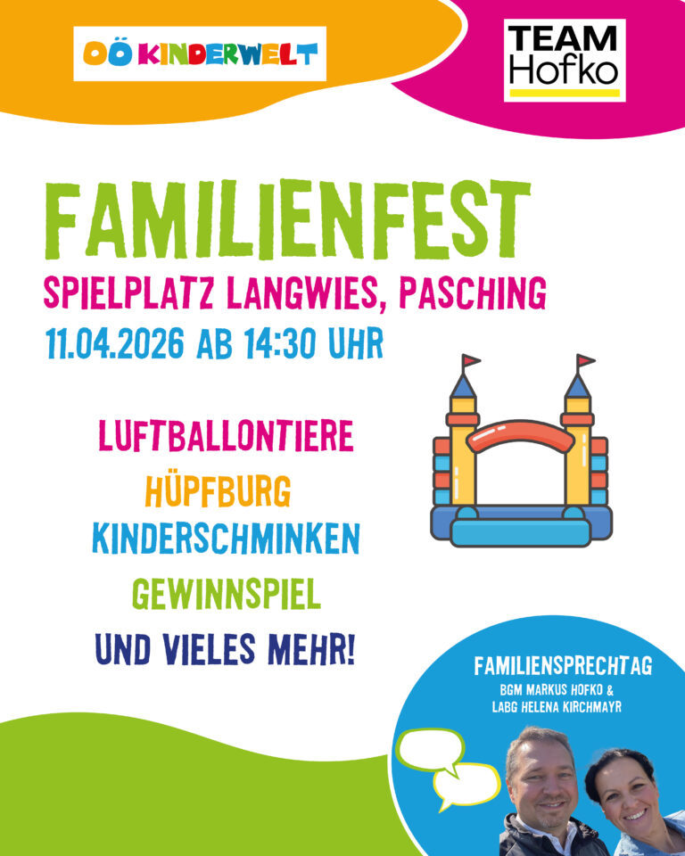 Am 11. April 2026 laden wir herzlich zu einem großen Familienfest in Pasching ein. Ab 14:30 Uhr erwartet unsere jüngsten Gäste am Spielplatz Langwies ein abwechslungsreiches und liebevoll gestaltetes Kinderprogramm, das garantiert für strahlende Gesichter sorgt. Mit dabei sind unter anderem eine Hüpfburg, Kinderschminken, Luftballontiere sowie viele weitere spannende Spiel- und Mitmachangebote, bei denen Spaß und gute Laune nicht zu kurz kommen.