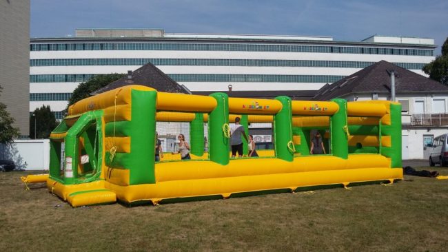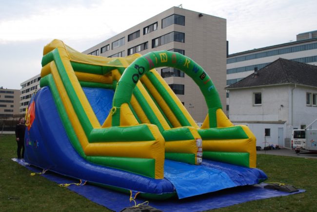 Action und Spaß auch für die Zuschauer! Vorraussetzungen: 2 Betreuer/innen Stromkreis 230 Volt (2 KW), 16 A trockene, ebene Fläche von 5 x 9 Metern mind. 5 m Höhe Beschreibung: Bevor der große Rutschspaß beginnt, muss der steile Aufstieg der Riesenrutsche erklimmt werden.