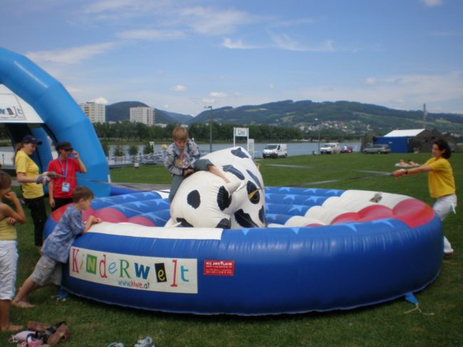 Action und Spaß auch für die Zuschauer! Vorraussetzungen: 2 Betreuer/innen Stromkreis 230 Volt (2 KW), 16 A trockene, ebene Fläche von 5 x 5 Metern mind. 3,5 m Höhe Beschreibung: Ein Kind sitzt am “Bullen” und versucht nicht runter zu fallen, während an 4 Seilen für Bewegung gesorgt wird.