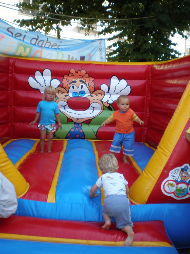 Action und Spaß auch für die Zuschauer! Vorraussetzungen: 2 Betreuer/innen eigener Stromkreis 230 Volt (2 KW), 16 A trockene, ebene Fläche von 6 x 6 Metern mind. 3,5 m Höhe Beschreibung: Kleinkinder (bis 3 Jahre) werden eingeladen, sich auf ebener Fläche im Hüpfen und Springen auszuprobieren.